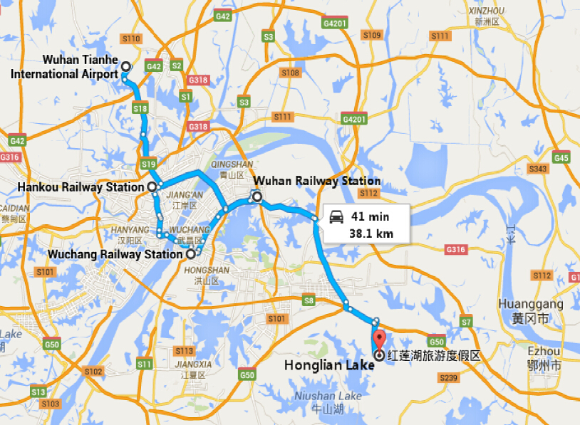 Honglian Lake Golf Resort is 80 kilometers from Wuhan Tianhe International Airport, 55 kilometers from Hankou Railway Station, 40 kilometers from Wuchang Railway Station, 37 kilometers from Wuhan Railway Station and 2 kilometers from the venue.