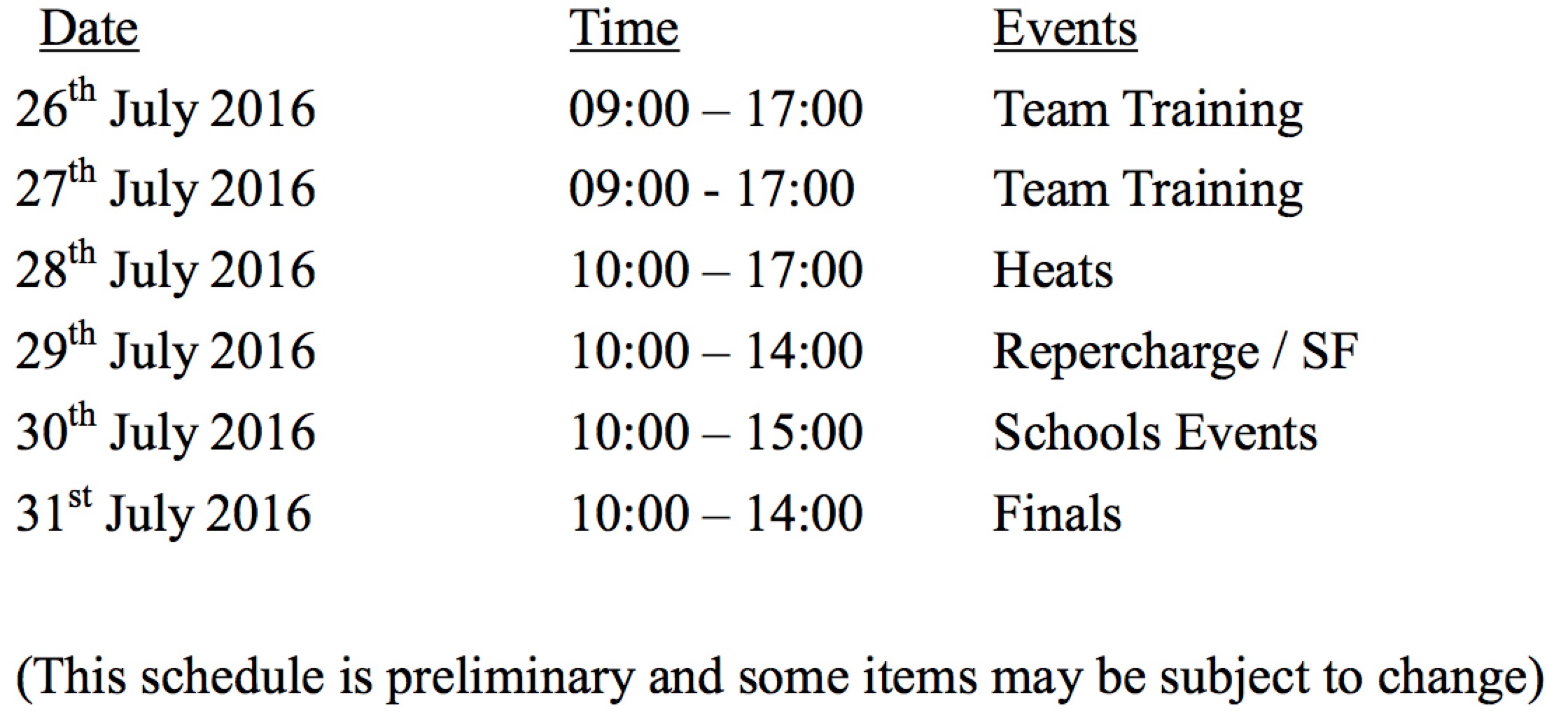 Detailed information of arrival and departure dates and flight number or train number should be informed in advance to OC via Online Form A in order for OC to arrange local transportation and other necessary preparations. (Applicable to Foreign participants only). Teams are advised to arrive in Singapore by 26th of July 2016 and depart by 1st of August 2016.
